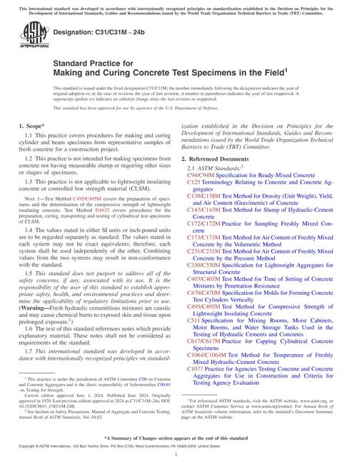 1.1 This practice covers procedures for making and curing cylinder and beam specimens from representative samples of fresh concrete for a construction project.